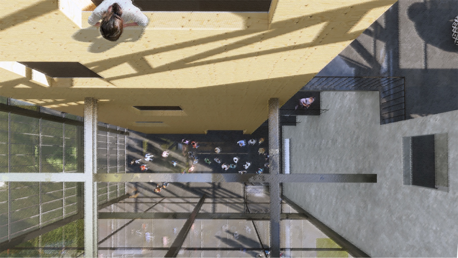 When entering the building, people enter a hall with a full-height atrium and secondary volume representing reimagined circulation that support and