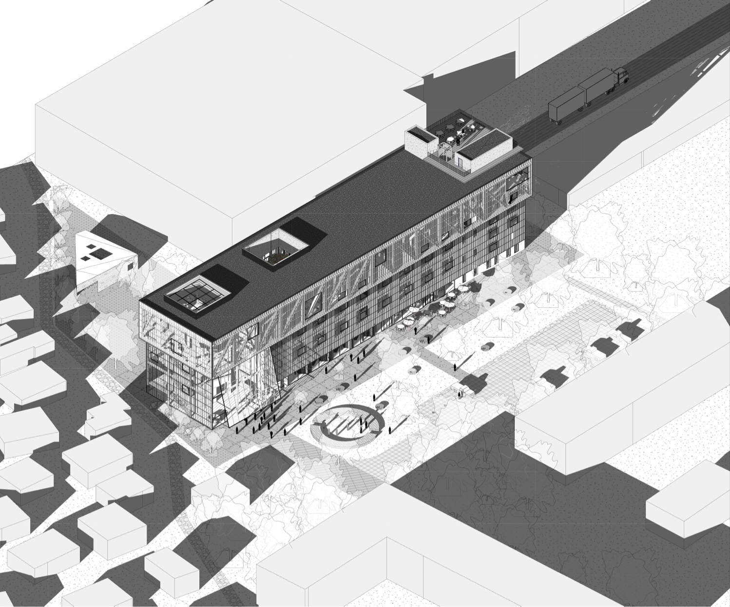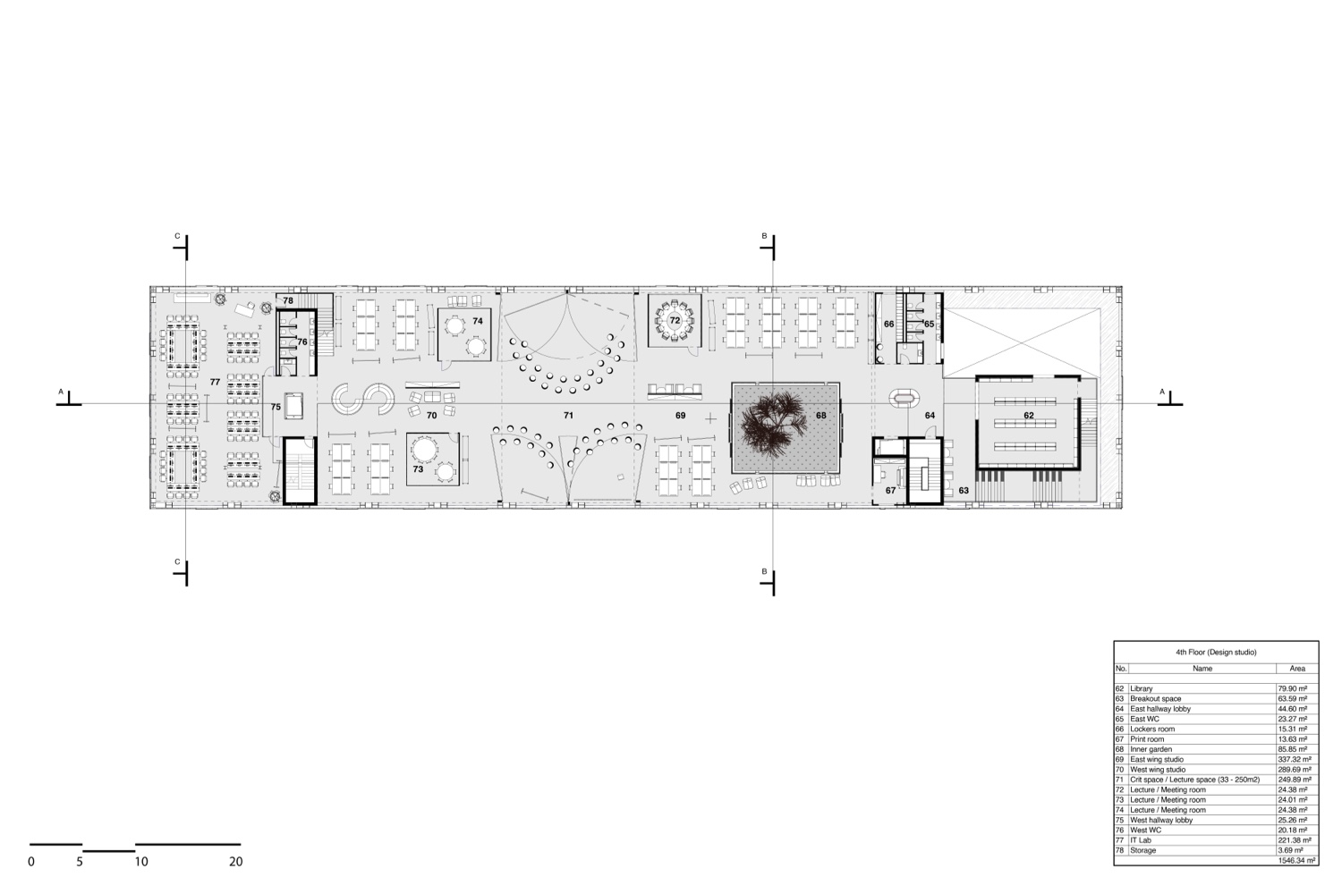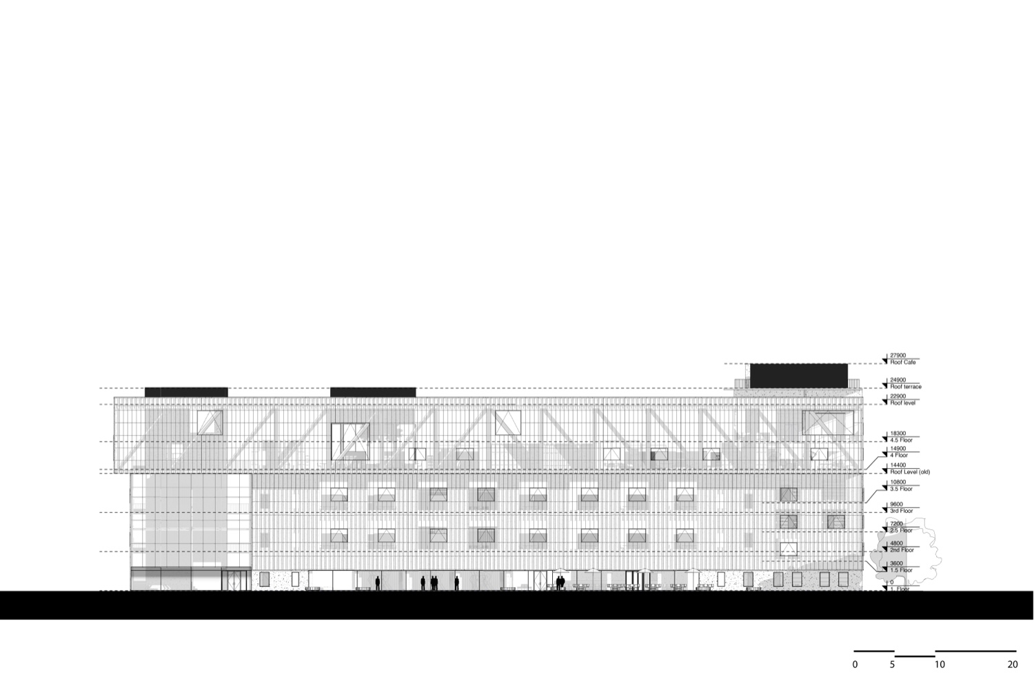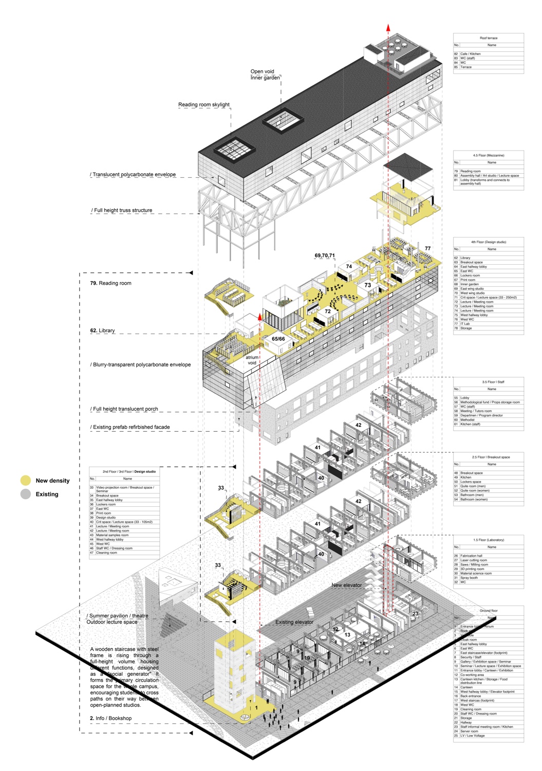spaces as well as IT Lab and two mezzanine levels with a reading room and assembly hall. The roof has a summer terrace which also could be used for lectures,