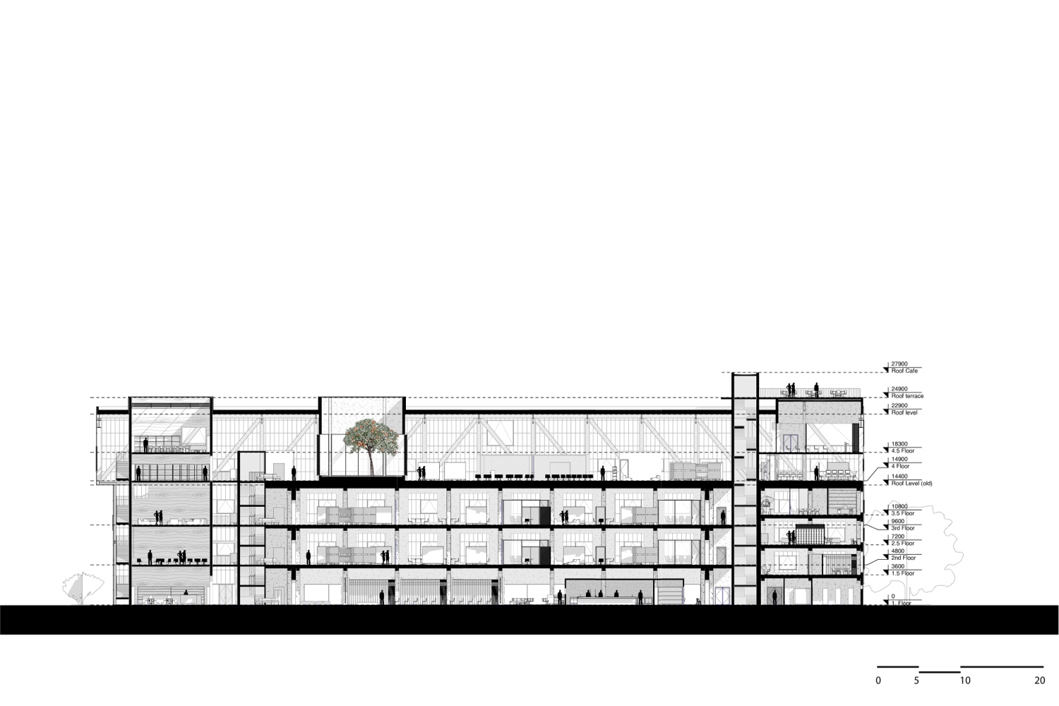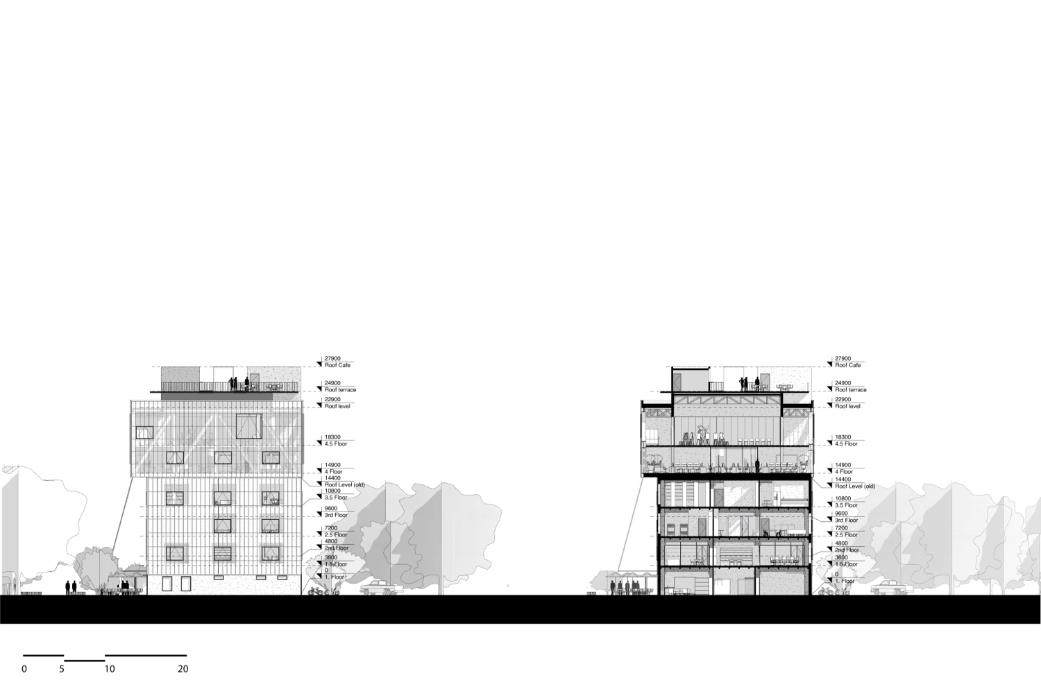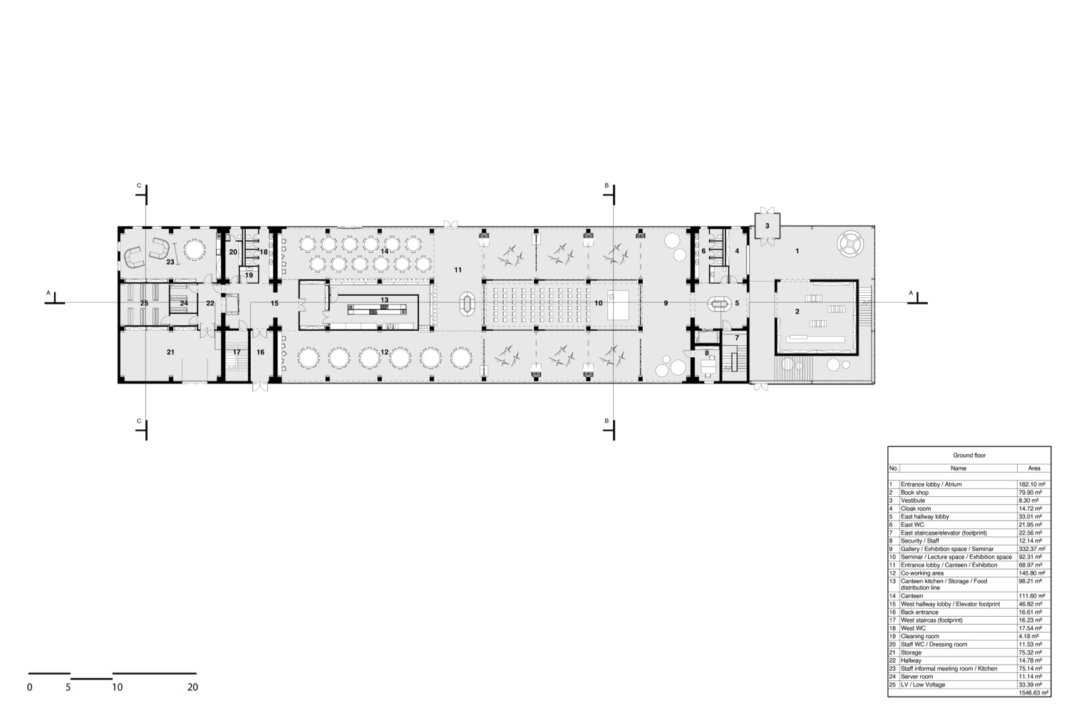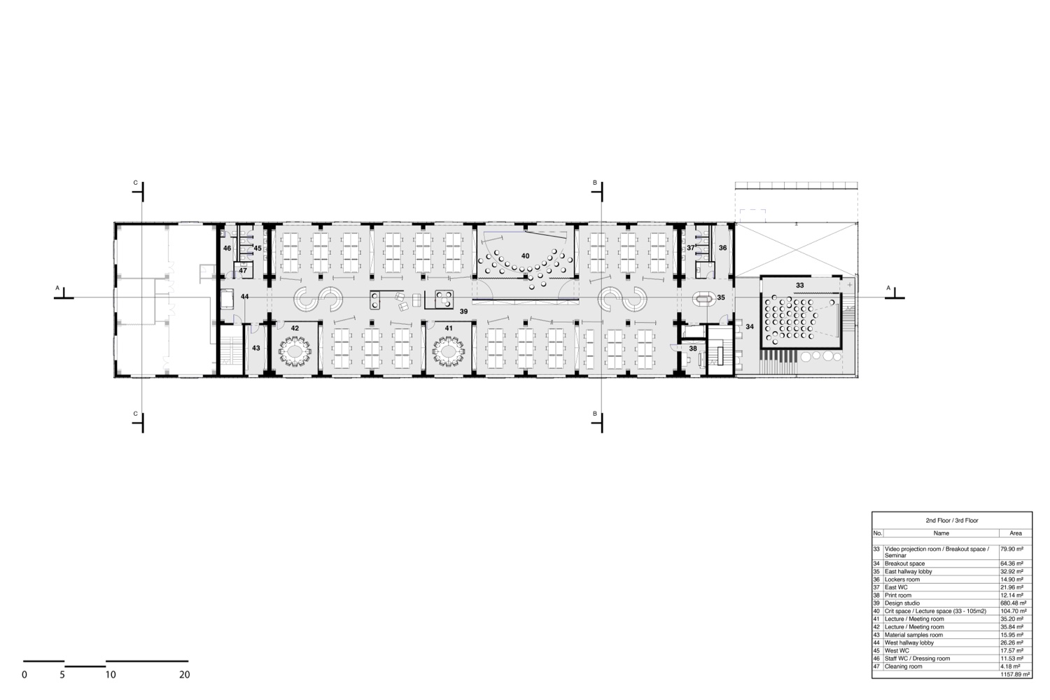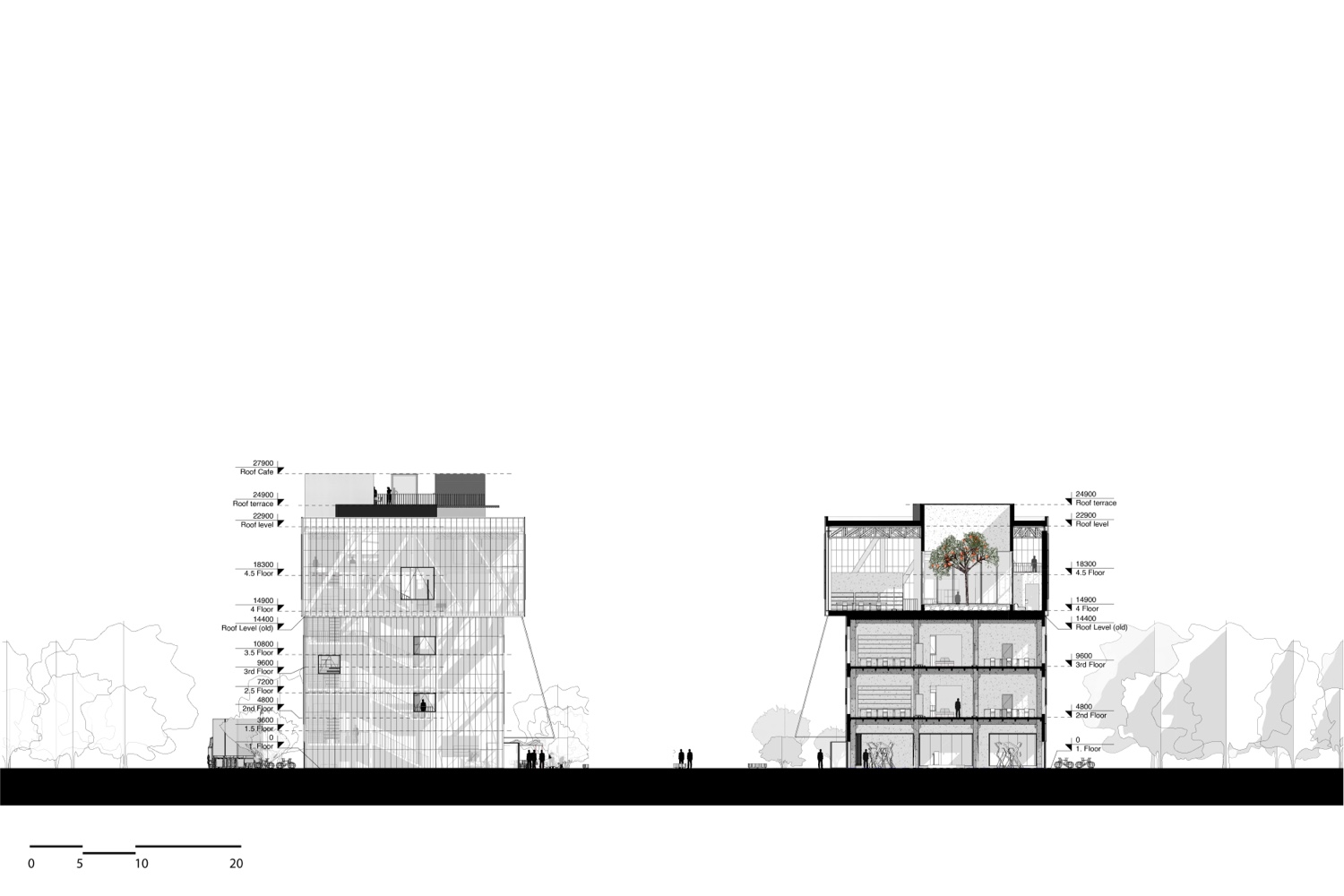 spaces as well as IT Lab and two mezzanine levels with a reading room and assembly hall. The roof has a summer terrace which also could be used for lectures,