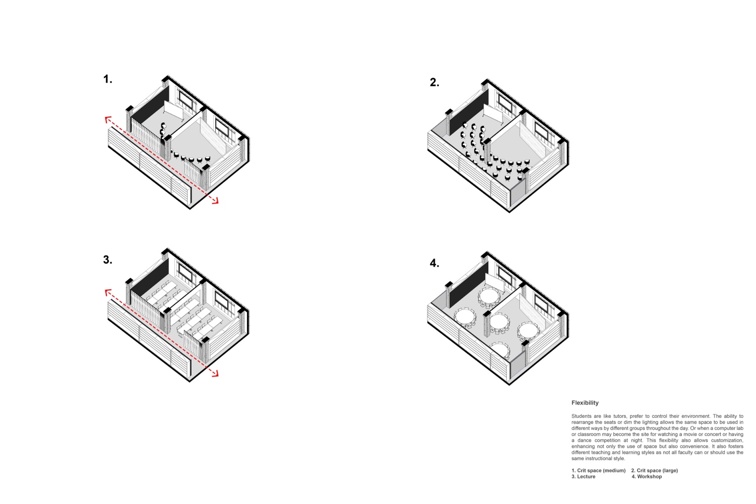 communicate the school’s philosophy and influence the school’s spaces for creative tasks. The breakout space, video projection and lecture room, library and