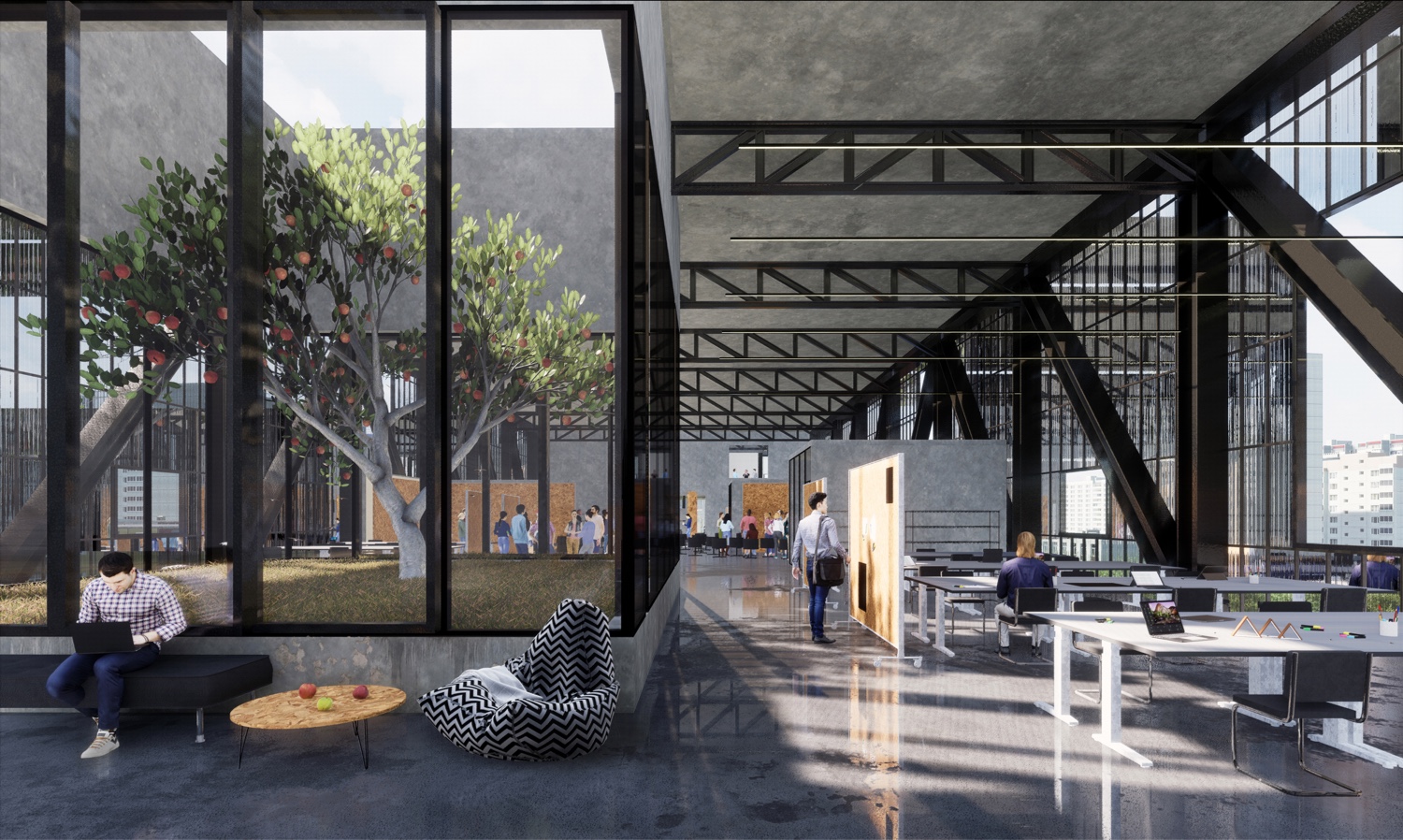 The design studio on the fourth floor has a more flexible layout, due to the new truss system, which additionally includes an inner garden, and transformable crit