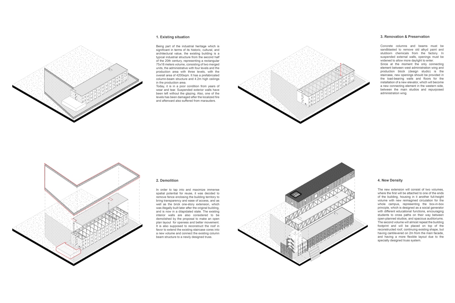 proposed to house a new architecture school in the existing Soviet factory building belonging to the clients, which was set up in the 60s and was a part of Kirov