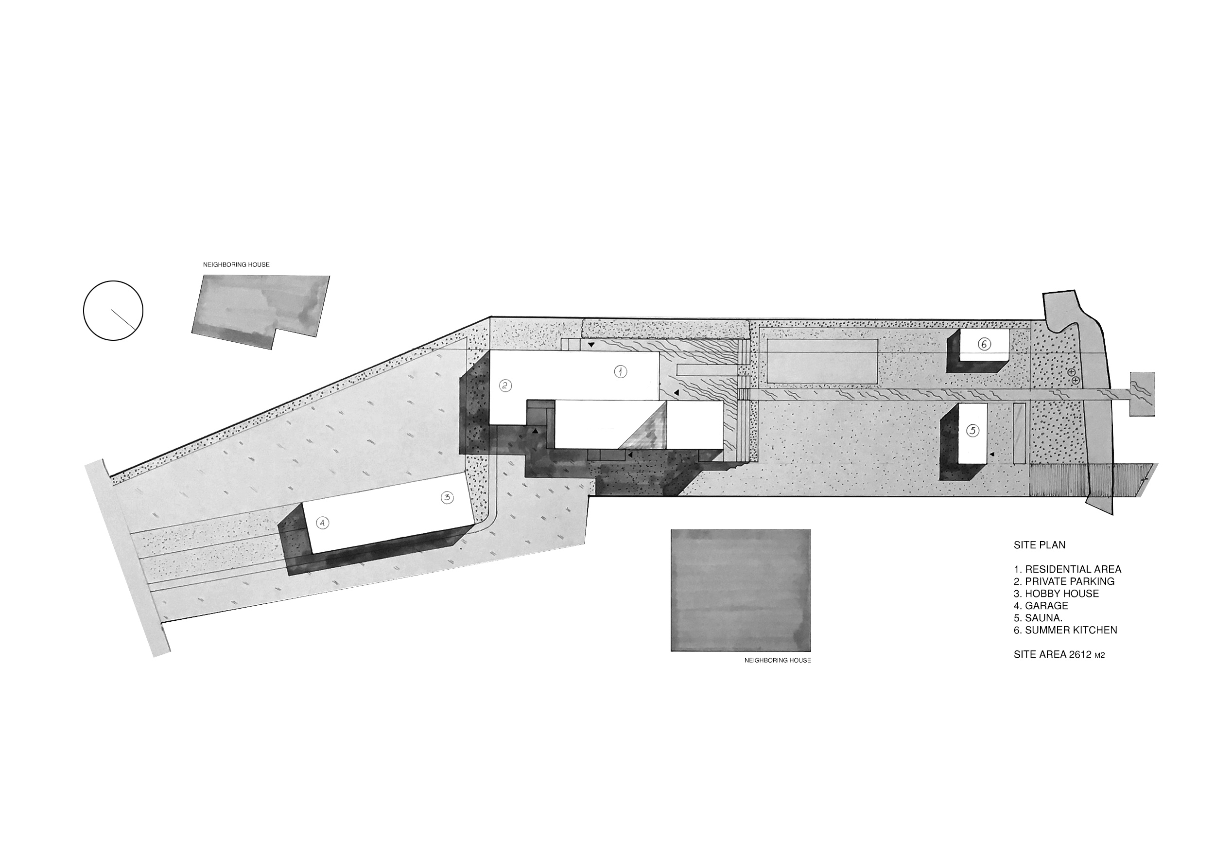 To meet the needs, half of the site from the entrance part was given under the hobby house and public repair garage, where the house itself acts as a link