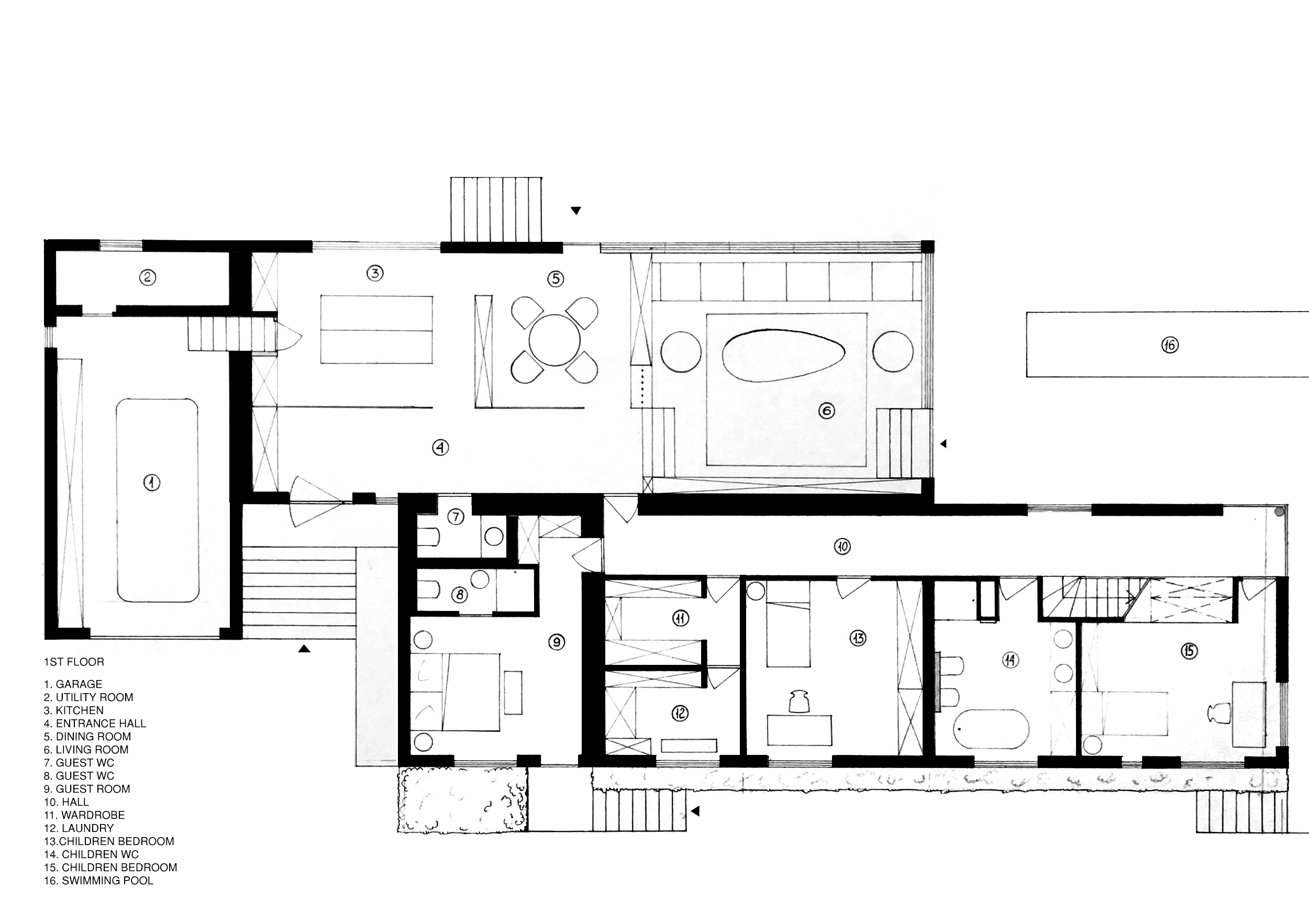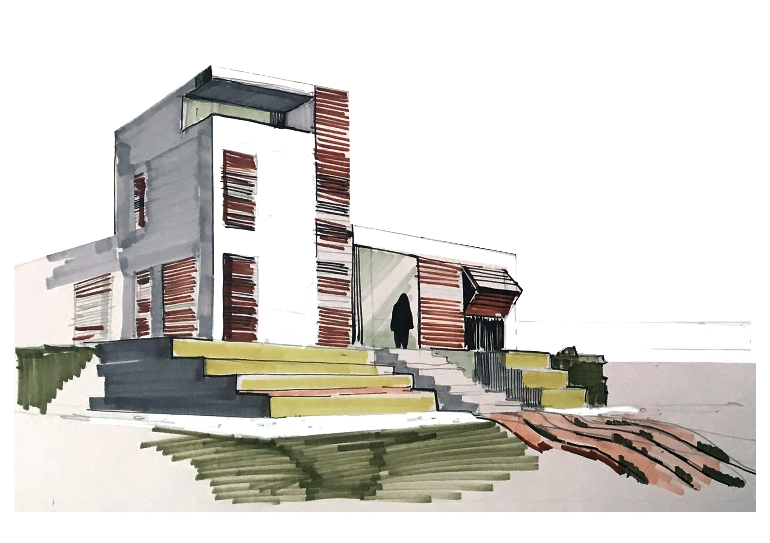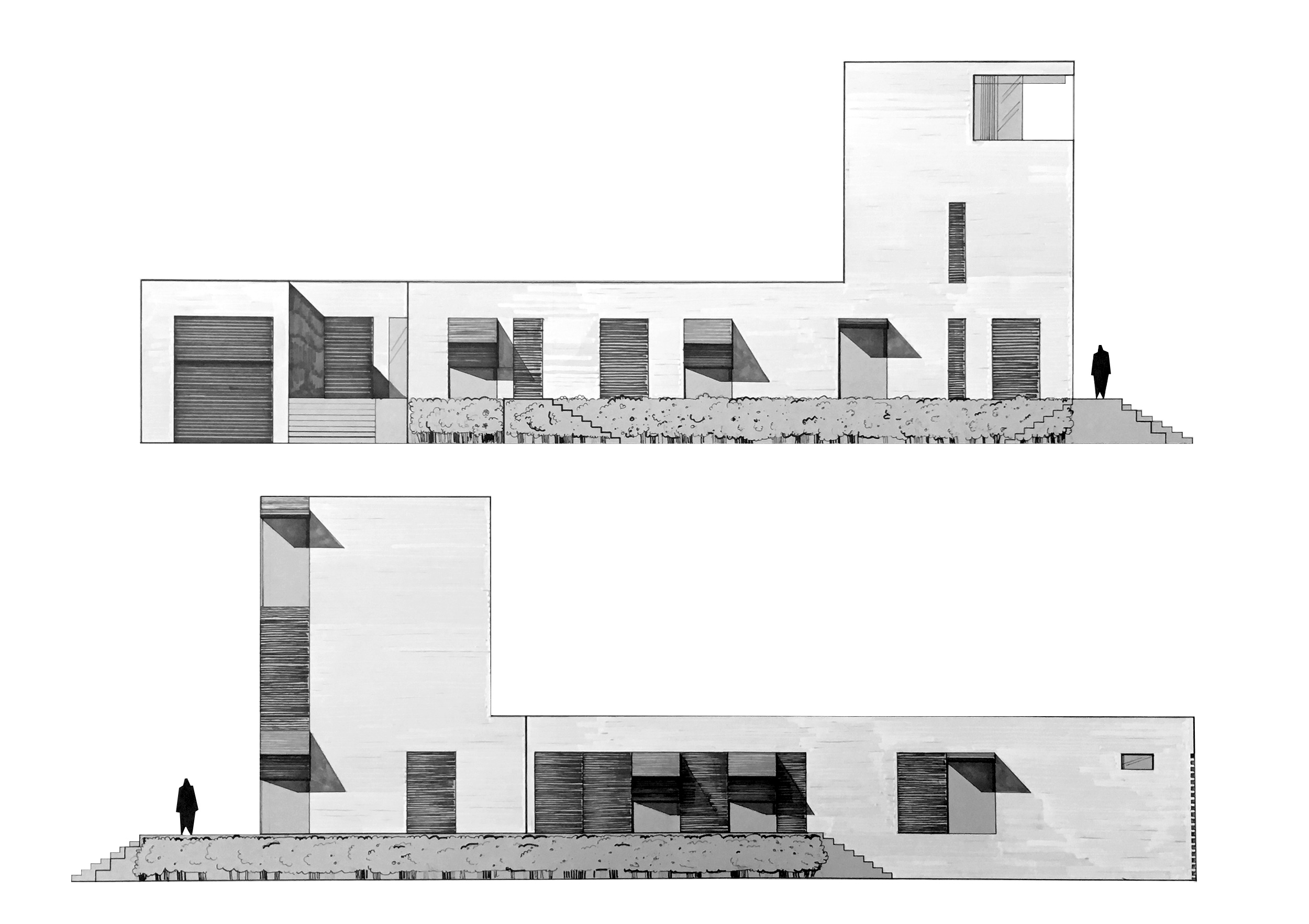 between public and private areas. Consisting of two main blocks and a small tower, the house has a separate driveway. To emphasize its entrance, it visually