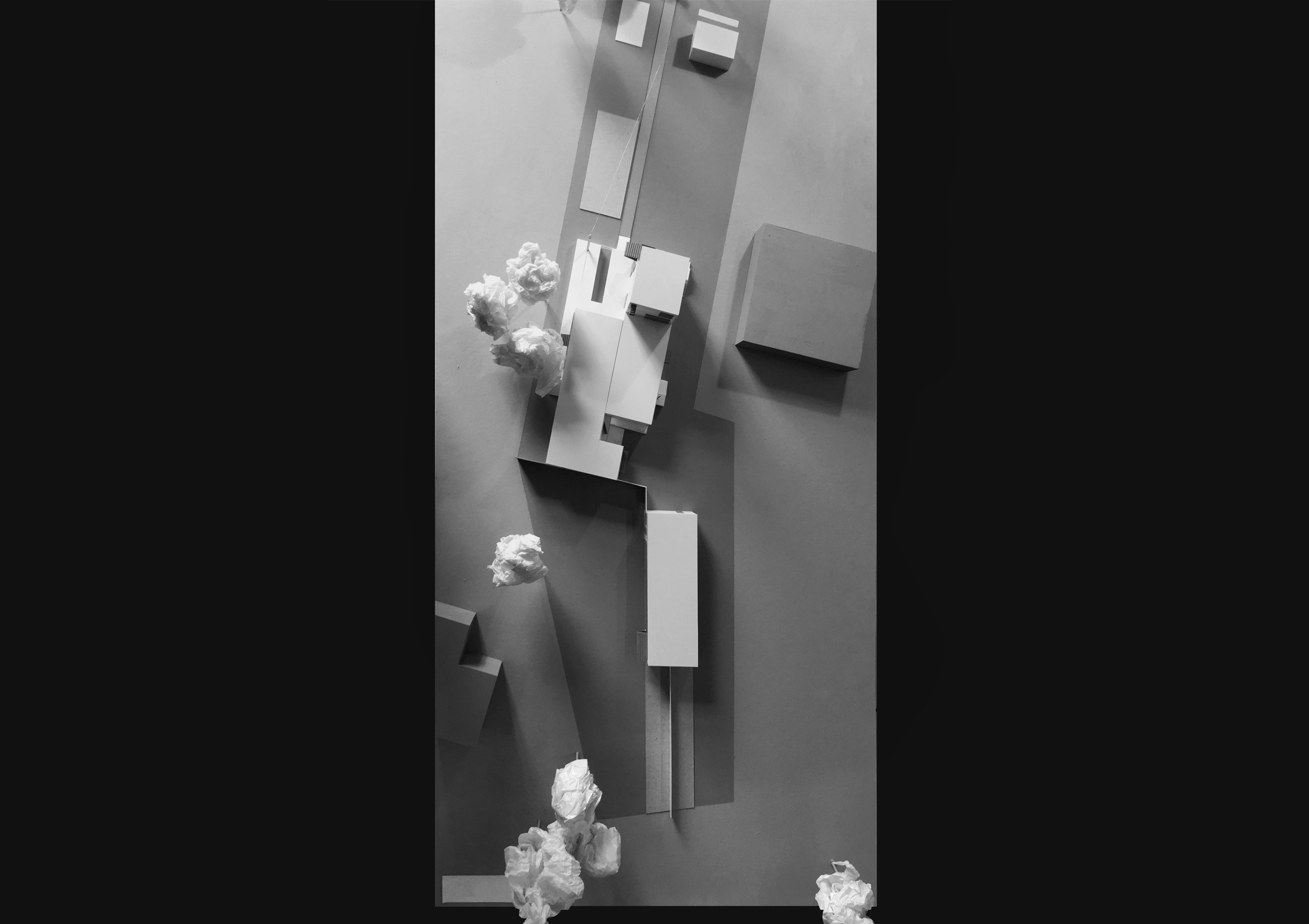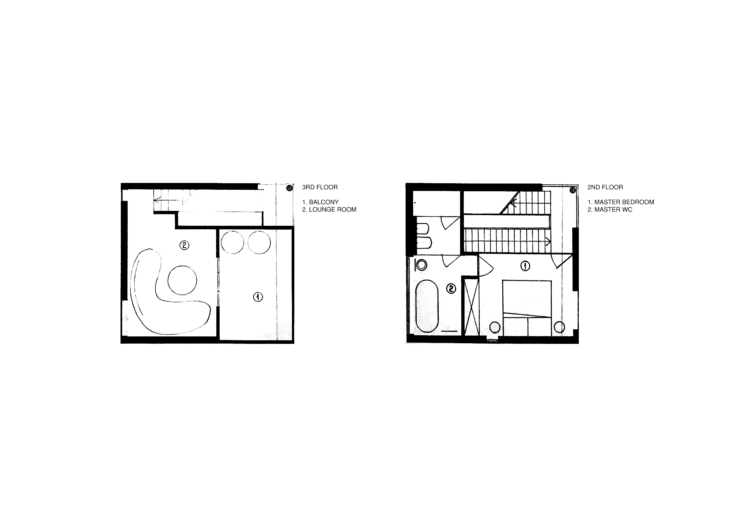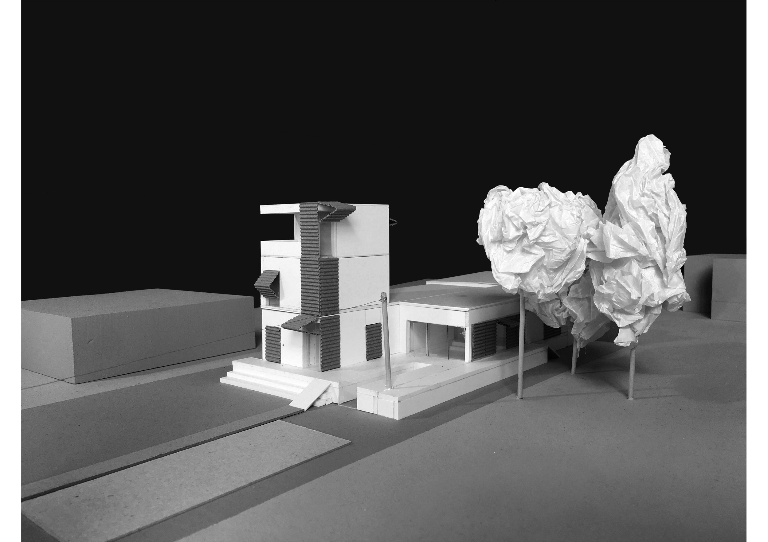 The second block, containing only bedrooms, private facilities, and a staircase to the upper levels, is positioned to create the arrival yard and an enclosed space