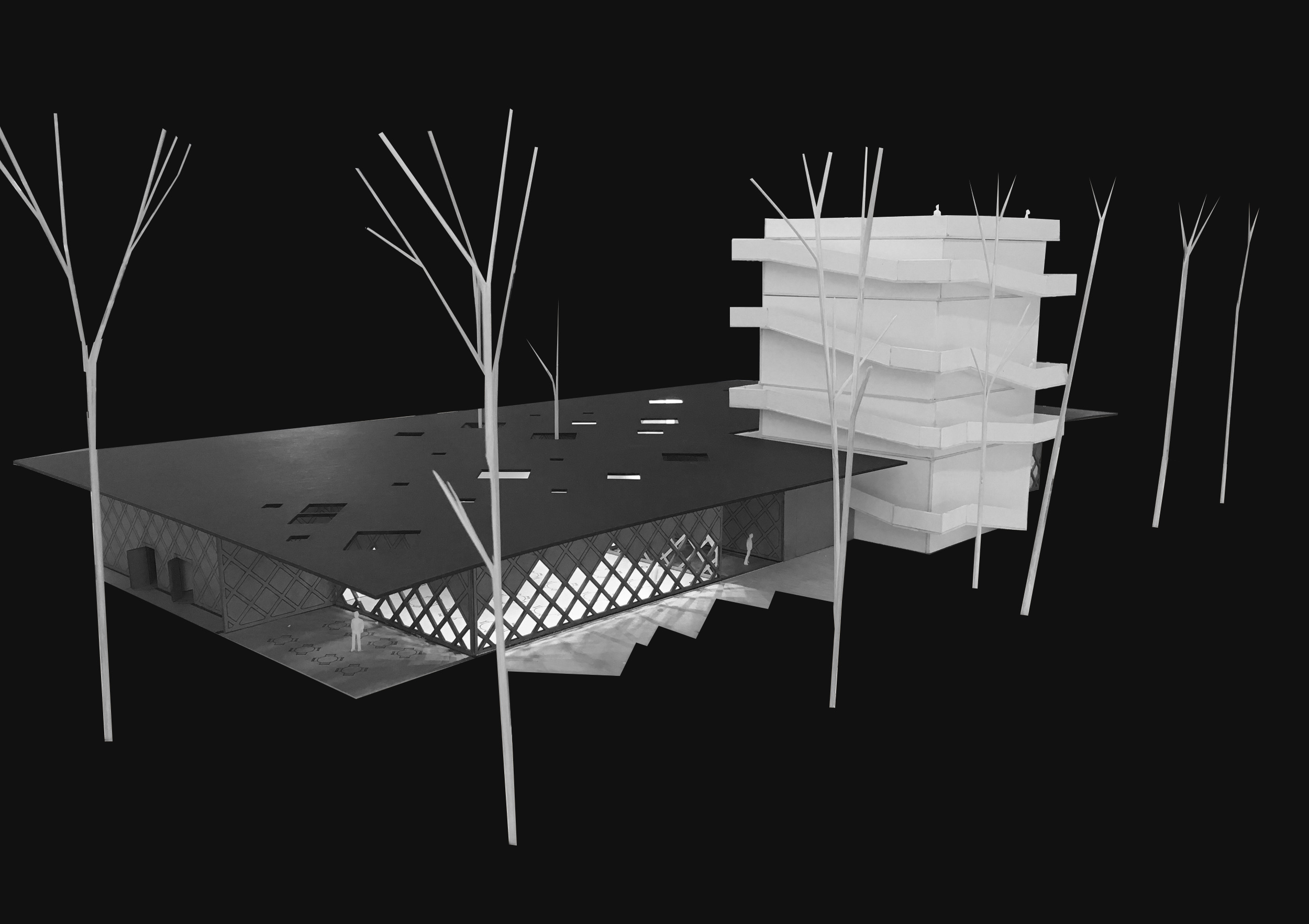 sculpture tower and a terrace beneath a cantilevered roof with semi-closed gardens where design focuses on creating a link between the building