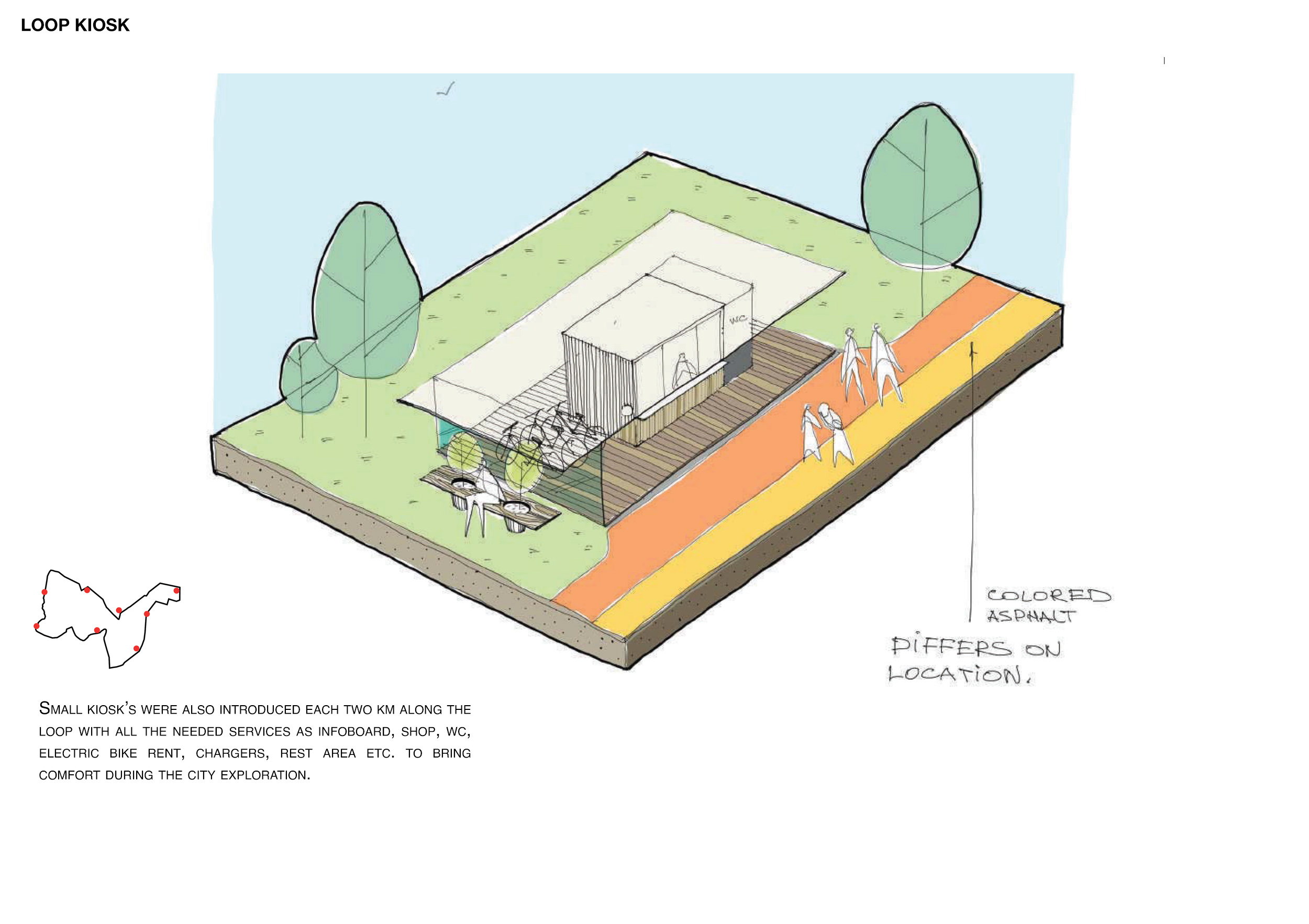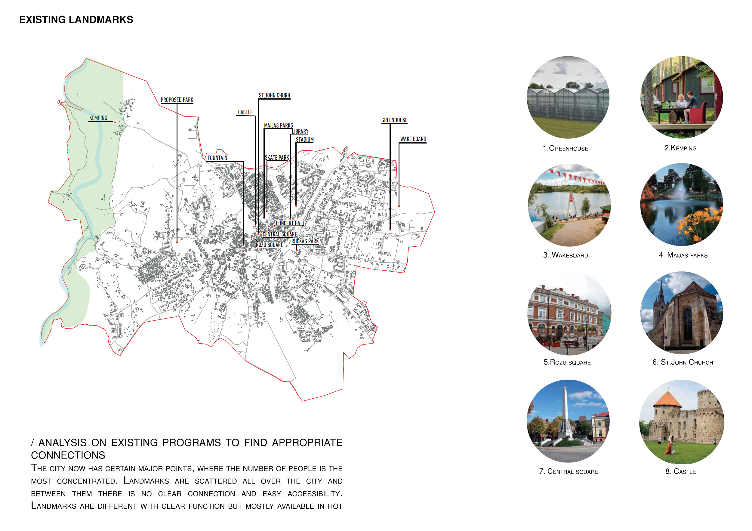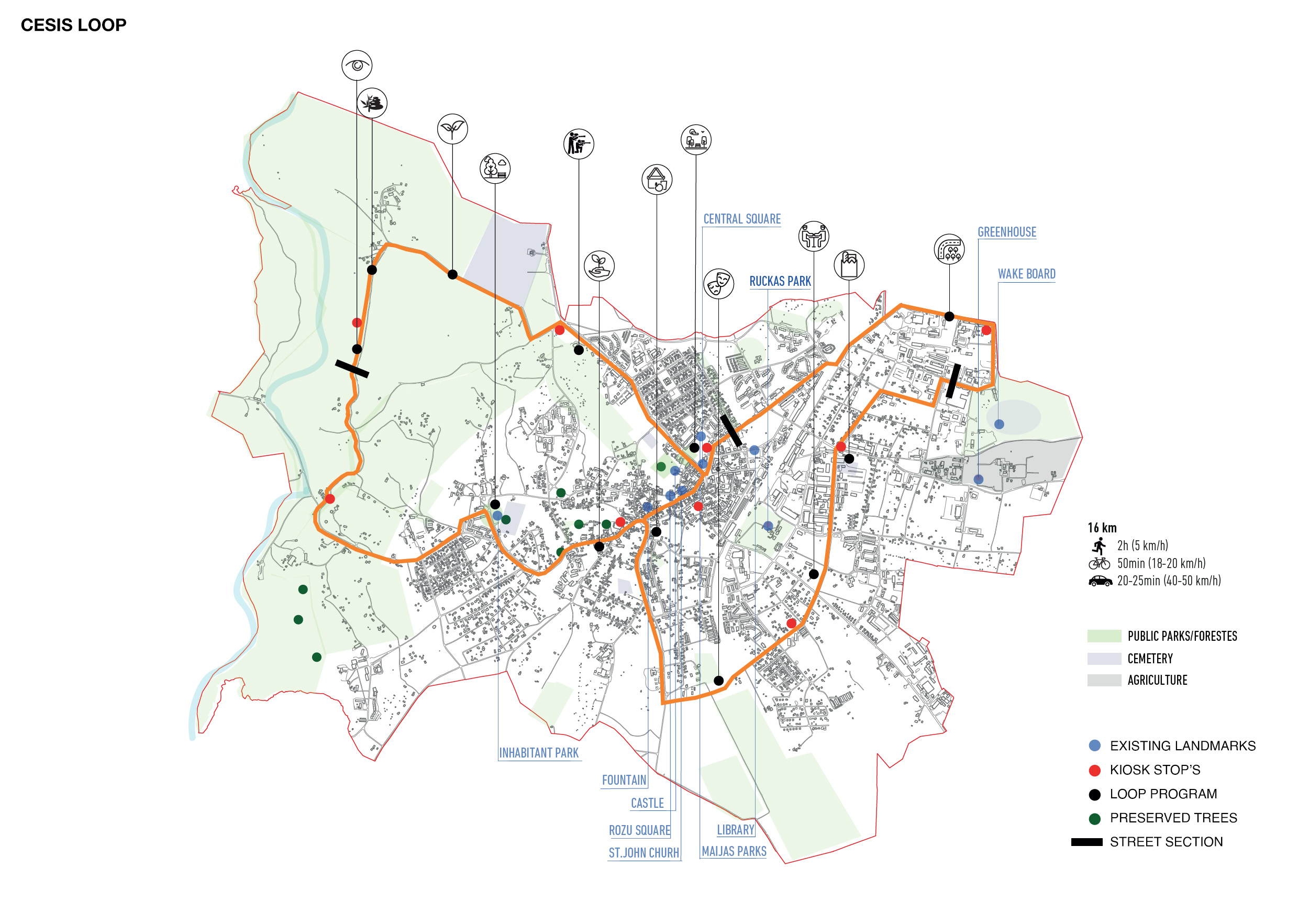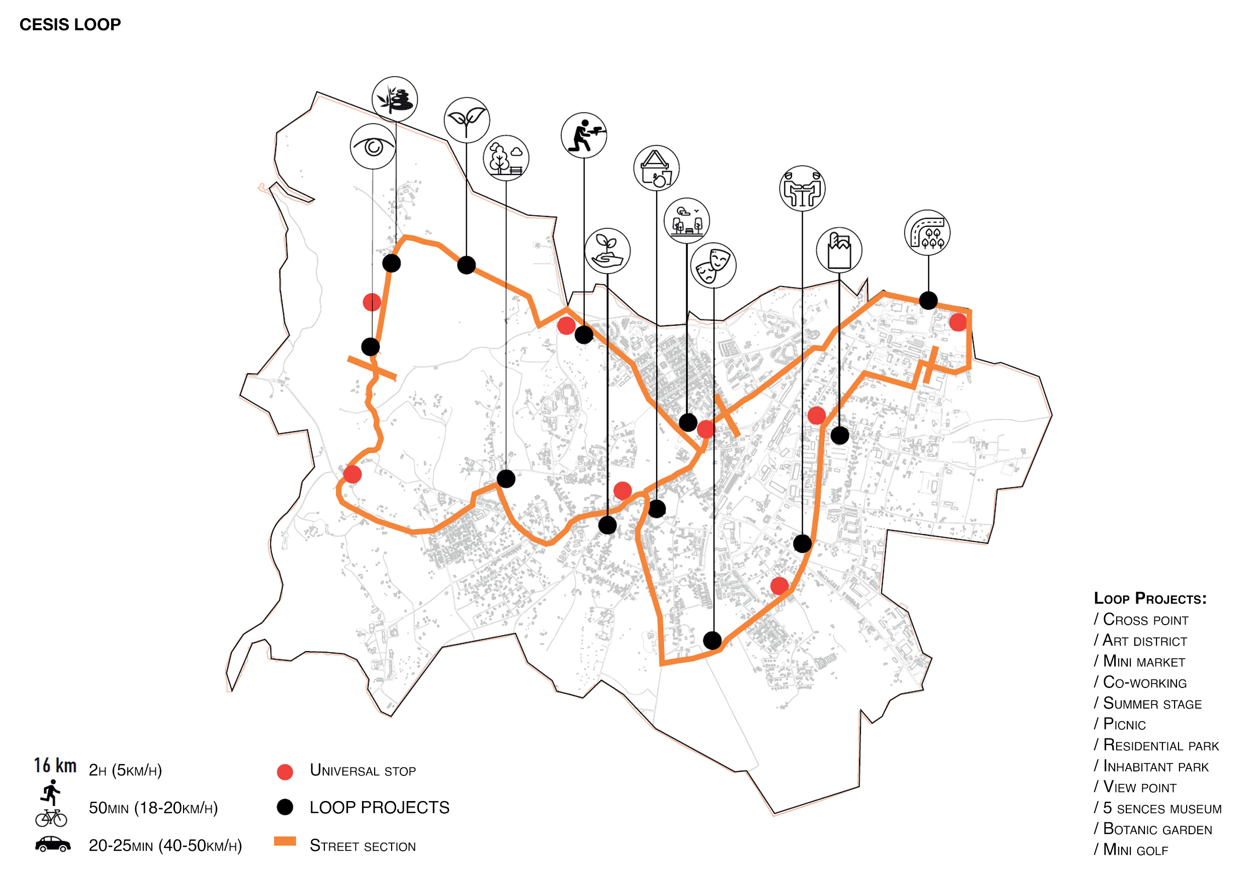 Cesis is a charming city fusing together medieval history and contemporary culture. The unique feel and hospitality of this 800-year-old city attract tourists all year long – from the Baltic’s biggest ski resorts to the preserved medieval layout of the cobbled streets of Cesis Old Town. The proposal for the LOOP came from the analysis where the city is divided into three parts atmospherically and physically leaving all attraction points scattered around and sometimes without access for visitors. Cesis LOOP acts as a one connection element through all the city’s most interesting parts which in addition will include new different interventions. In the consequence, it creates a city as one organism. To make a feeling of the loop and bring a modern physical response, some of the design elements repeat on all its way, creating a subconscious dialogue with inhabitants.