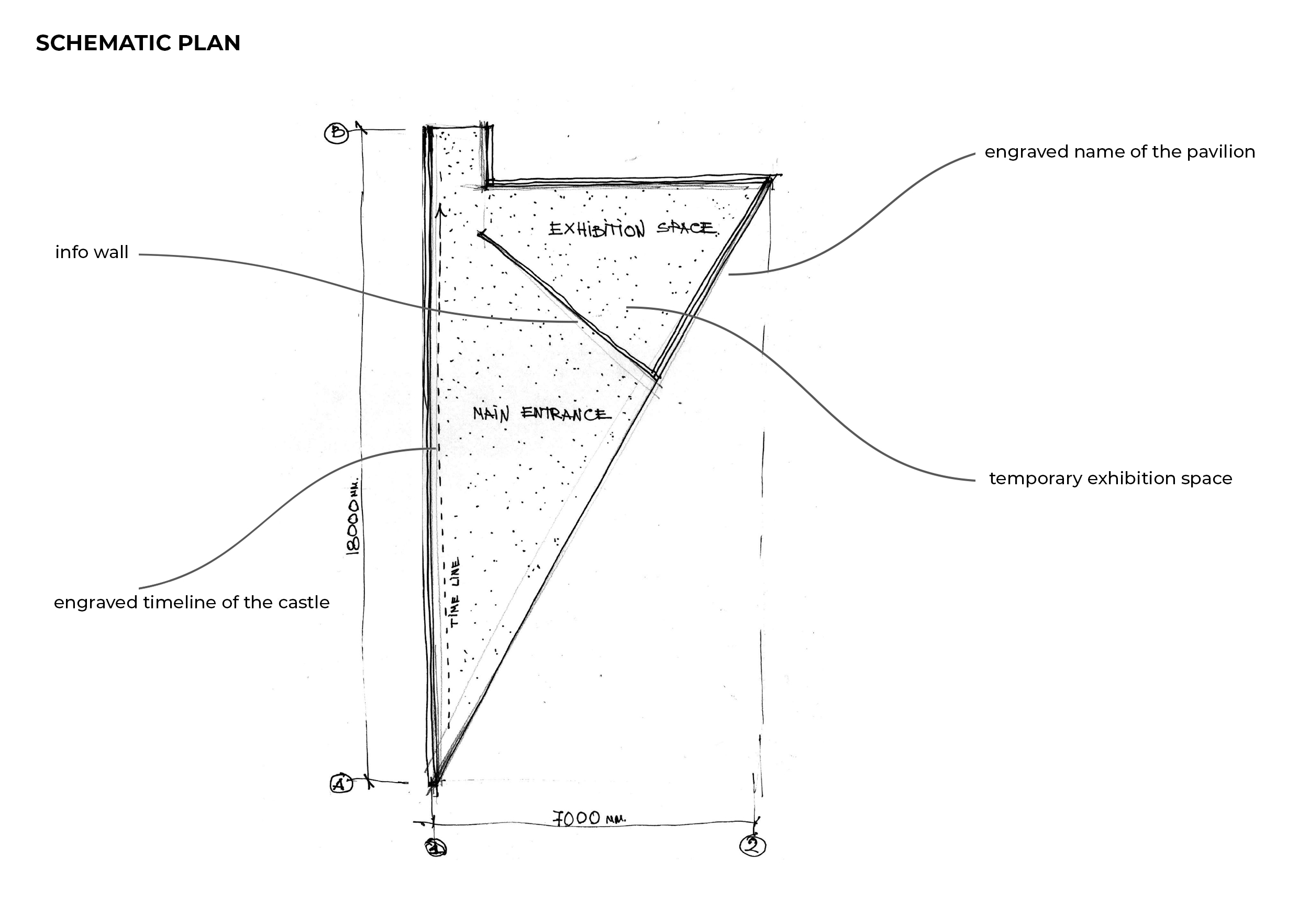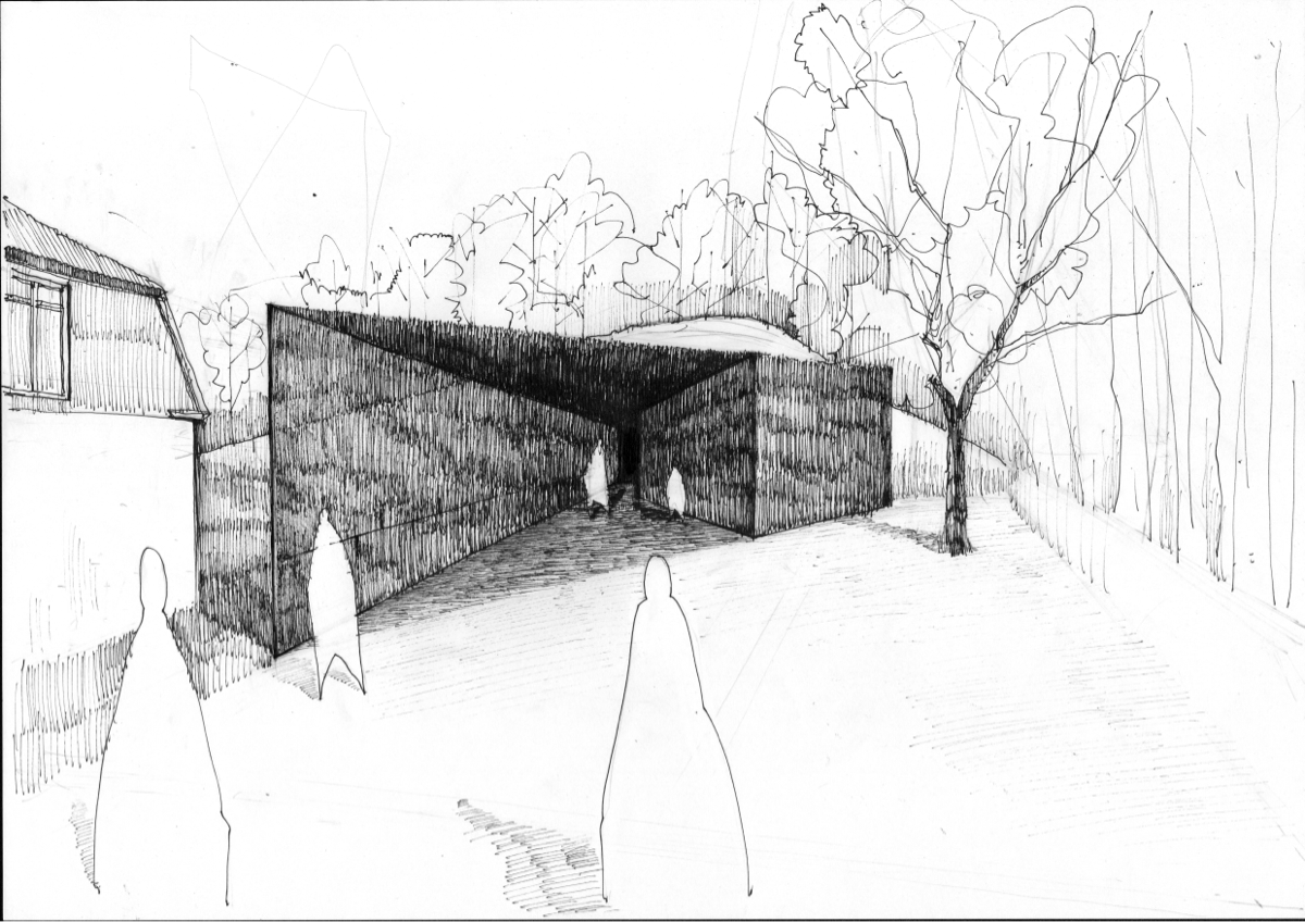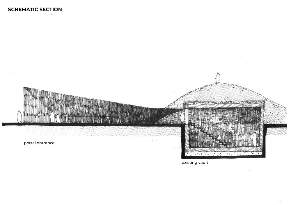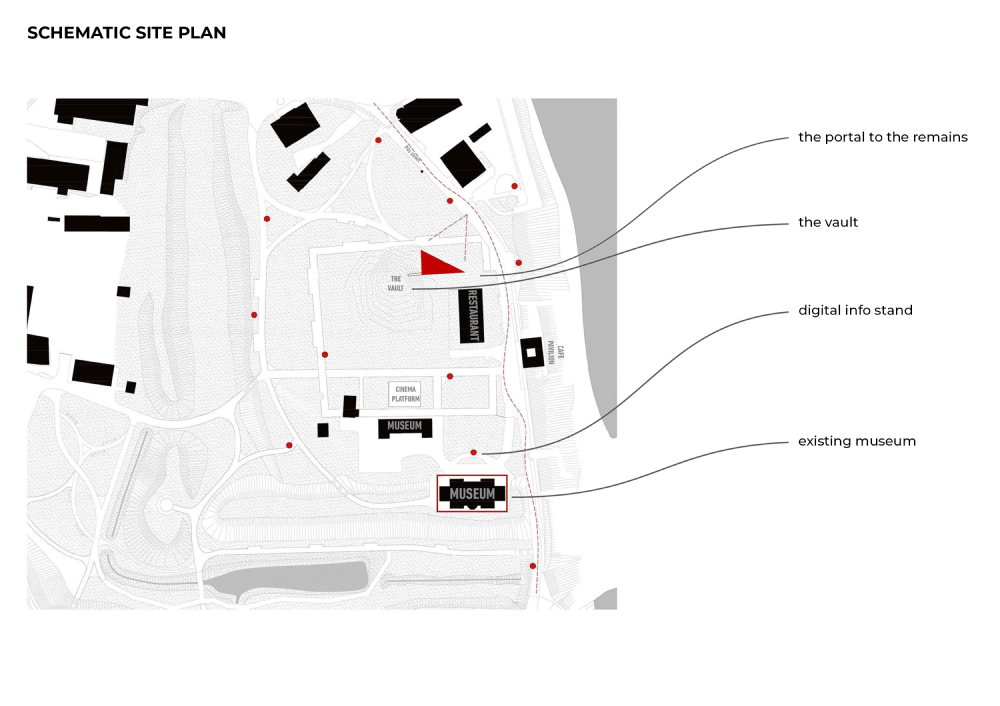 Kuldīga is an old town and urban construction monument of national importance, protected by the Republic of Latvia’s laws and regulations, which was included on the World Heritage National List prepared by the Latvian National Commission for UNESCO. Thus, it is a message about an expansion in Kuldīga’s importance, the opening of the town to the world, and in a way also recurrence in time… The selection of the site for the construction of the Order’s Kuldīga Castle was associated with the time when the Baltics were invaded and subjugated, namely, the early 13th century. Researchers of history indicate that the site for the Kuldīga Castle was selected for strategic reasons. Giving the voice to the lost majesty to something that exists and not exists at the same time is a very challenging task. Considering the cultural importance of the landscape of Kuldiga Castle, it was essential to understand how to touch it, to find the principles that will help to offer something to this place. The charter for the protection and management of the archaeological heritage together with the Nara document was taken as a ground for understanding the general guidelines and source of ideas for policies and practice of governments as well as scholars and professionals in this field. The idea was to deliver something which will complement the existing park infrastructure, museum, and the only survived vault, the only piece of authenticity in the castles perimeter… The "temporary" structure that was proposed for the entire site was a “portal to the remains”. Totally made of perforated corten steel, having the triangular shape in the plan, where the elevated part facing the Pils street-alley and decreasing in height to the side of vault entrance, makes the effect of the void, experiencing mental transition to the past through the prism of modernity, inviting people inside. One of its walls has a stretching counter relief timeline showing the historical periods of the castle. A small exposition space is also hidden behind the outer wall of the portal. The choice of perforated corten steel can be justified as a reflection of the former power of the castle at the same time recalling the fact that there is nothing eternal... To avoid the disturbance of any surviving archaeological evidence, almost leaving the vault in its current condition, the only element that was proposed for it, is the meshed steel cascade staircase inside the entrance part of the vault. Material, with its almost total transparency and at the same time its strength, will leave space in its original appearance giving the possibility to use staircase as a platform for seating, when watching different documentary films on the projected opposite wall of the vault.